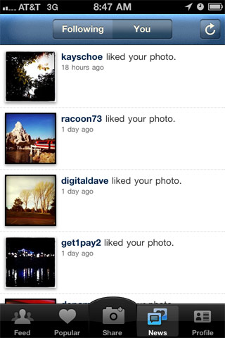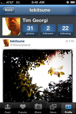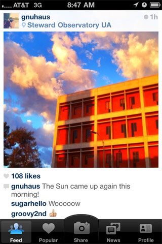 The idea for Instagram came from the mashing of the love for “instant” photography and the concept of telegrams being sent “over the wire” (or Internet as the case may be). What you get is a stream of photos that come from all over. They can be from your friends, your co-workers, or even perfect strangers. Once you download the app (which is free, by the way), you’re well on your way. How this all works is you can either take a photo with the Instagram app or select an image from your Photo Library and then, inside the app, you can add one of the filters to your photo or leave it untouched. There are a nice set of filters that are included with the app to help transform what could be a generically okay photo and help it look a bit more professionally processed. Once you filter (or not), then you add some info about the photo, some tags like on Twitter, and you’re done. Right now, when you post a photo, you can share individual photos on Flickr, Facebook, and Twitter. If you specify a location with your photo, you can tell the app to check you in on Foursquare.